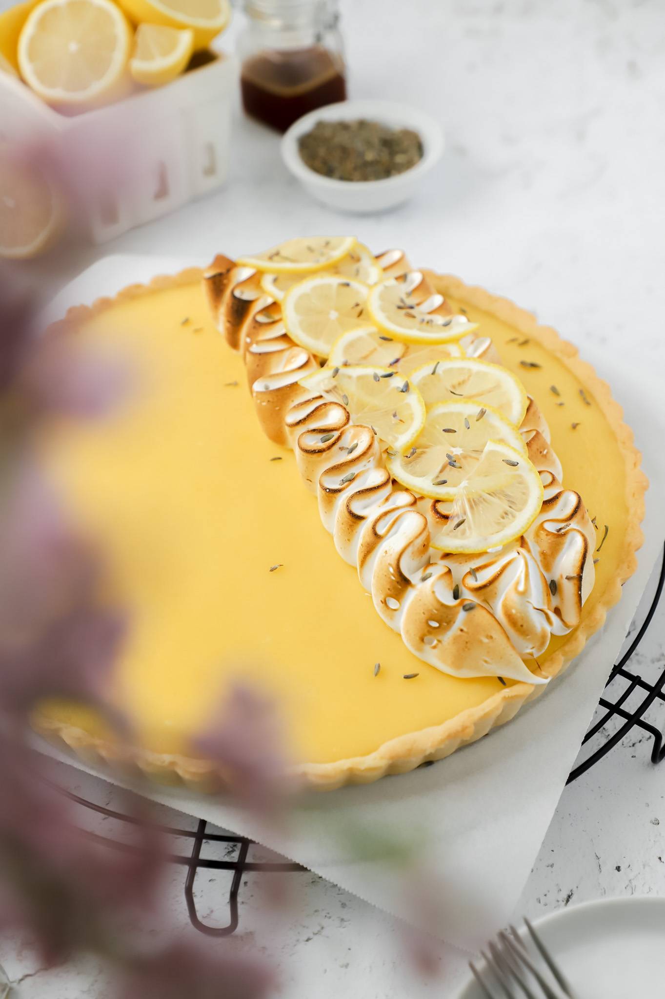 A refreshing treat to get you excited for spring after all that winter baking, this lemon lavender tart blends sour, sweet, and floral in the most perfect way. Lavender tart shell filled with tangy lavender lemon curd and topped with a sweet honey meringue, an excellent dessert to get you thinking about warmer weather.