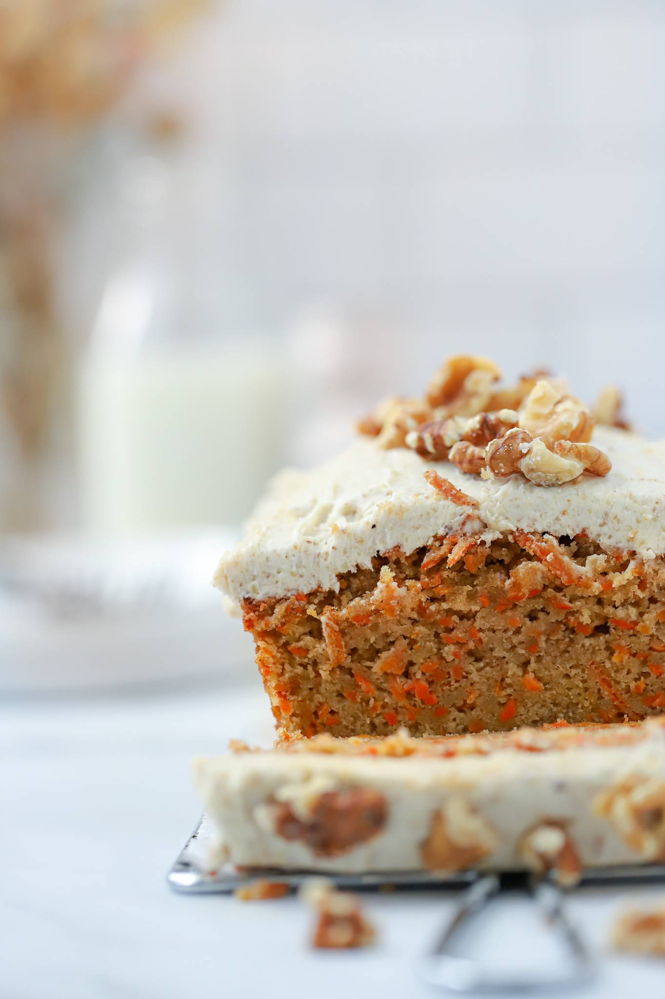 A classic twist on a regular carrot cake this saffron carrot cake recipe is made in a loaf pan and topped with walnut cream cheese frosting! This super rich and decadent cake recipe is easy to make and a show stopper to serve for Easter dessert. No tacky carrots adorning this carrot cake!